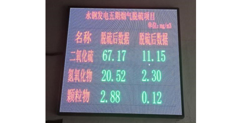 公司EPC總承包的聯(lián)峰鋼鐵有限公司電力廠5#煙氣脫硫項(xiàng)目自投運(yùn)以來(lái),通過對(duì)鍋爐煙氣脫硫前后參數(shù)的采集與對(duì)比,對(duì)脫硫劑小蘇打的噴吹量實(shí)現(xiàn)自動(dòng)調(diào)節(jié),經(jīng)過一個(gè)月的調(diào)試,除塵器出口煙氣含塵顆粒物、SO2,氮氧化物的含量均低于國(guó)家超低排放行業(yè)標(biāo)準(zhǔn),達(dá)到公司承諾運(yùn)行保證值,滿足性能考核要求。脫硫后的排放數(shù)據(jù)實(shí)時(shí)顯示到大屏,對(duì)外公布。