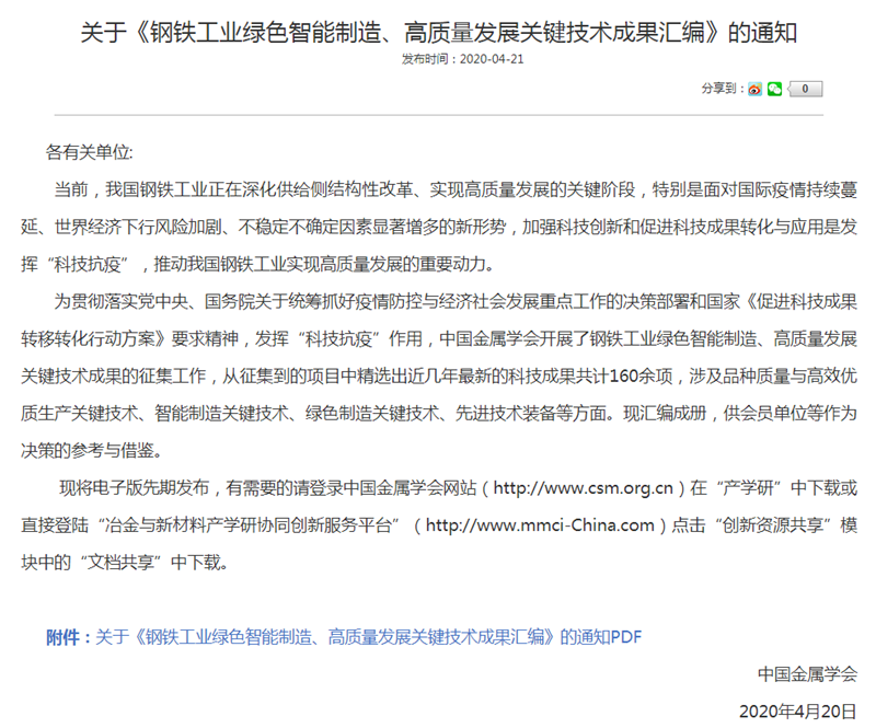 2020年4月21日,中國金屬學會發布了《鋼鐵工業綠色智能制造、高質量發展關鍵技術成果匯編》,公司“清潔、高效、大型焦爐的應用技術”、“焦化煤調濕技術及SDM-HB2干燥破碎機”、“一種高架式設計的熱連軋生產線”以及與山東墨龍石油機械有限公司聯合申報的“墨龍HIsmelt熔融還原工藝”共4項技術入選。