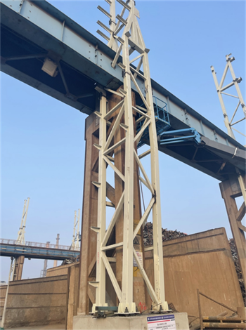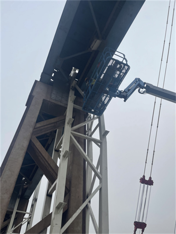 項目開工后,項目部將施工圖與現(xiàn)場實際巧妙結合,立足保證原棧橋系統(tǒng)完整、獨立運行為宗旨,攻克多項改造重點、難點。如利舊原有承臺短柱、鋼柱貫穿制動板現(xiàn)場加固、斜桿穿吊車梁腹板并規(guī)避電纜橋架等障礙物、大跨度屋面桁架梁跨外吊裝等。提前策劃好每個節(jié)點,做到現(xiàn)場施工完全落實設計意圖,實現(xiàn)了結構安全、質量可靠、進度可控、經濟合理。