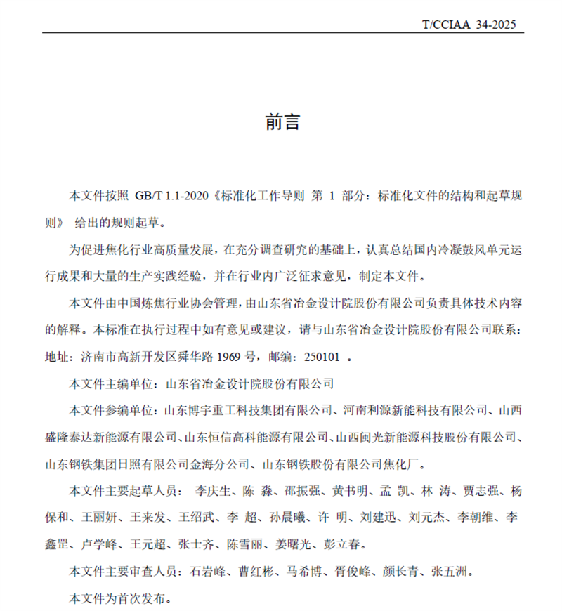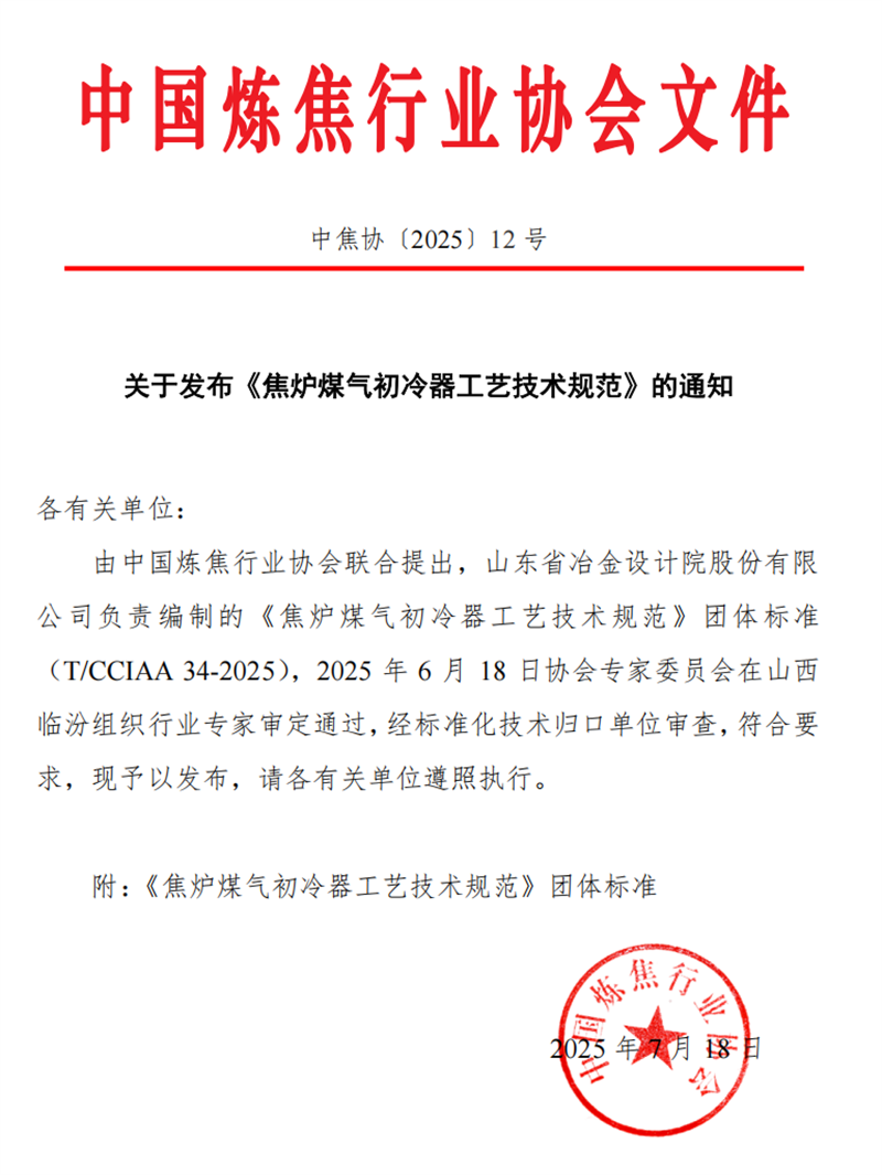 7月18日,由山冶設(shè)計主編的《焦?fàn)t煤氣初冷器工藝技術(shù)規(guī)范》T/CCIAA 34-2025(簡稱《規(guī)范》)正式發(fā)布并實施。《規(guī)范》對焦化煤氣凈化初冷器的工藝流程、操作參數(shù)以及質(zhì)量指標(biāo)作出了詳細規(guī)定,同時統(tǒng)一了初冷器的設(shè)計與操作標(biāo)準(zhǔn),保障了煤氣冷卻過程的高效性與安全性。《規(guī)范》的發(fā)布與實施,可指導(dǎo)焦化企業(yè)在生產(chǎn)過程中有效把控初冷器的日常操作,為后續(xù)煤氣凈化及深加工的穩(wěn)定運行創(chuàng)造有利條件。這是繼2024年7月1日正式實施、山冶設(shè)計主編的《焦?fàn)t煤氣脫硫廢液干法制酸技術(shù)規(guī)范》YB/T6115 - 2023之后的又一個行業(yè)規(guī)范,充分體現(xiàn)了山冶設(shè)計在焦化行業(yè)的技術(shù)引領(lǐng)作用與品牌影響力。